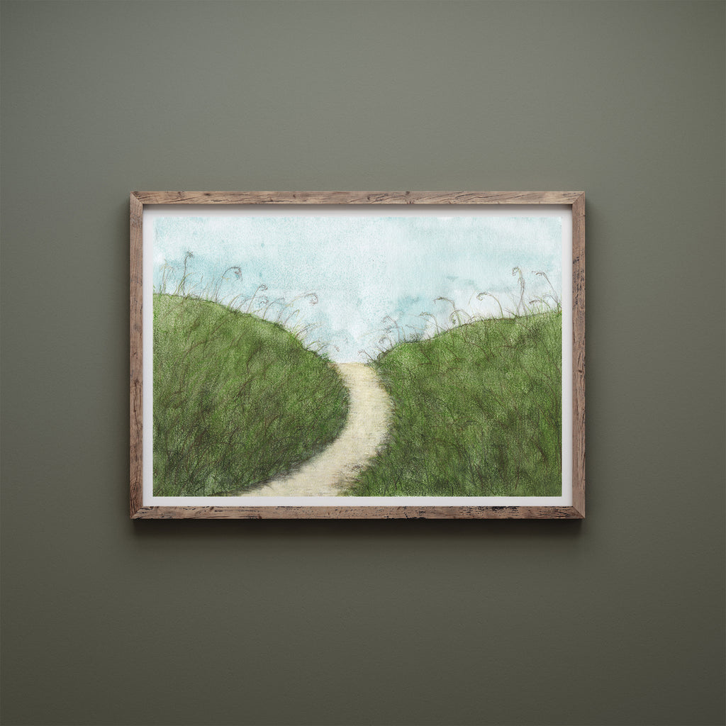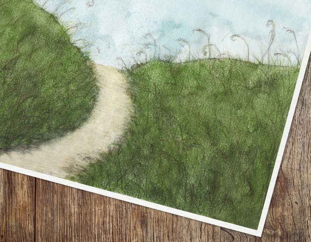 Fine Art Print from my original watercolour, pencil and pastel illustration titled 'Where the Road Goes'.